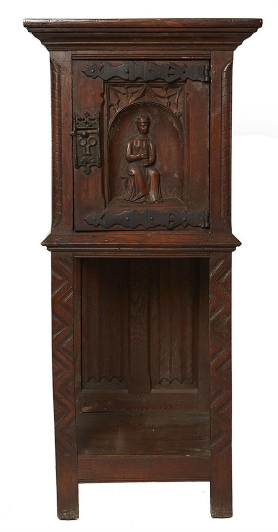 A 19TH CENTURY BELGIUM OAK COMMUNION WINE PEDESTAL CABINET, IN THE GOTHIC MANOR