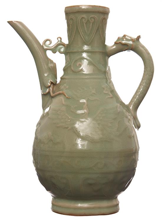 The wine ewer decorated with phoenix in relief and has a dragon form mouth and handles, 27.4cm high.