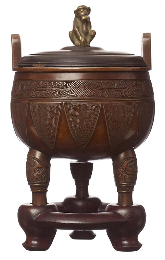 Decorated with lotus and zoomorphic face pattern, coupled with zoomorphic legs, 18cm high with stand.