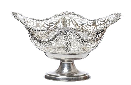 Of oval form the pierced body with laurel swags and rose embossed rim, raised from an oval stepped foot, weight 509 grams, 25.5cm long x 16cm high.
