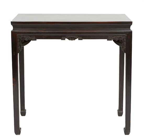 A rosewood table with a narrow top, carved legs connected with four hoardings reinforcement 82cm width x 38cm depth x 83cm height.