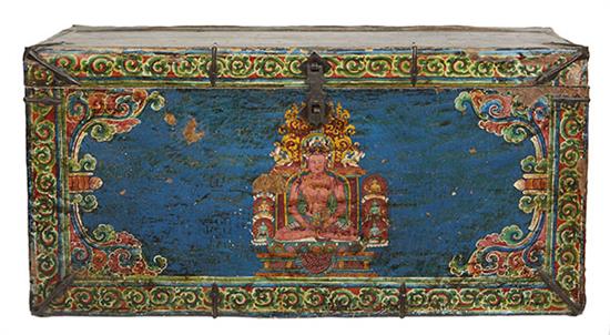 The wooden trunk with stretched leather exterior, decorated with brightly coloured dragons, Buddha and plants, late19th-20th century , 77cm width, 38cm depth and 39cm height.