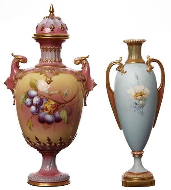 The blush pink vase and cover painted with fruit, the blush blue vase with floral spray, Rd No 203564 shape no 1618, 28cm high and Rd No 304838 shape no 1957, 22cm high.