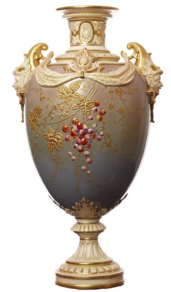 The reticulated neck above satyr mask handles supporting swags, finely painted with raised enamel berries and gilded foliate sprays on a blush purple ground, Rd No 141378 shape 1407, 35.5cm high, restored.