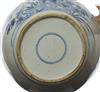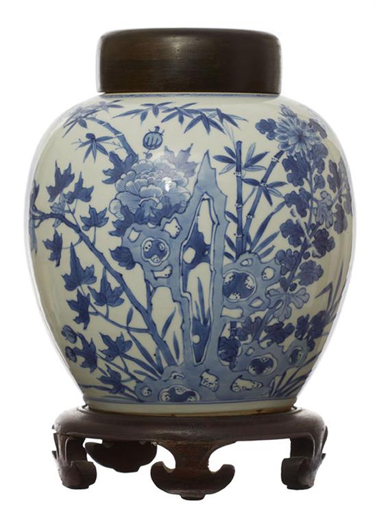 Low rim and full shoulder jar with stand, decorated with rocks, peonies, bamboo and chrysanthemums in blue glaze on white ground, 26cm high.
