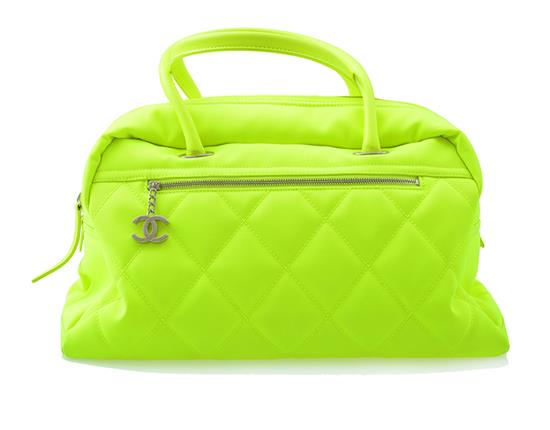 Styled in fluorescent lime green canvas with leather handles and silver metal hardware, authenticity card included, 11779869, 41 x 25 x 23cm, with box.