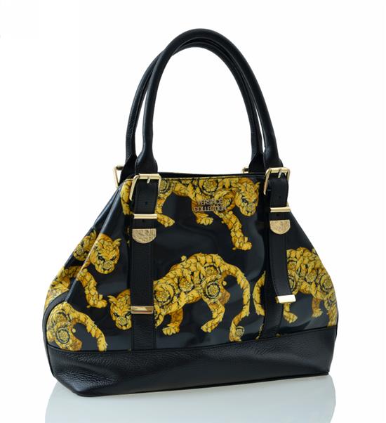 Styled in black vinyl with gold leopard design, black leather trim and gold metal hardware, 35 x 29 x 15cm.