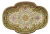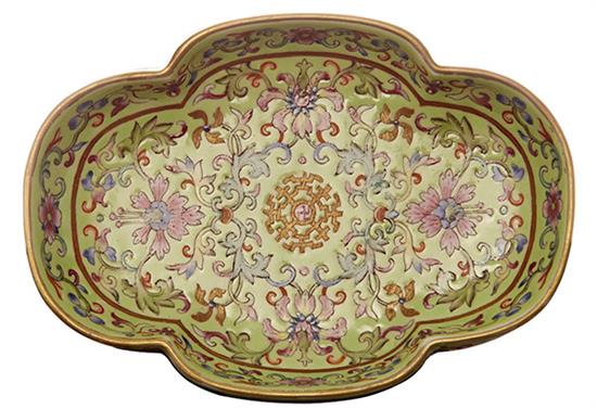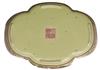 The begonia shaped footed dish decorated with green, rose and grey on a coloured glaze, 14cm wide.
