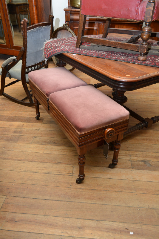 A LATE VICTORIAN WALNUT FRAMED DUET PIANO STOOL