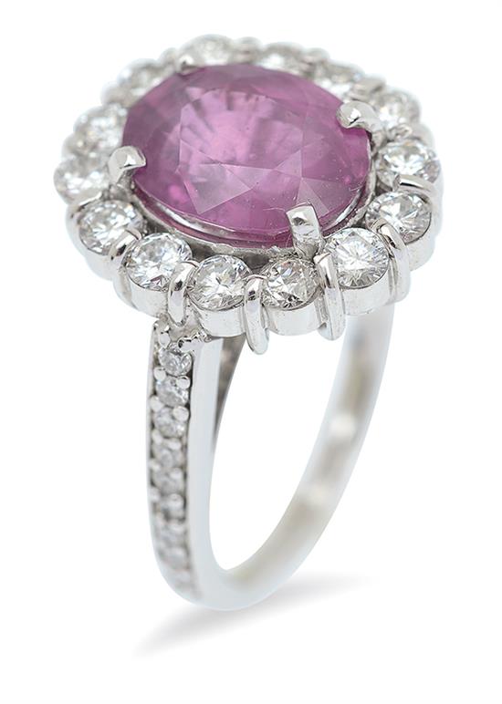 A PINK SAPPHIRE AND DIAMOND CLUSTER RING