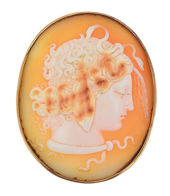 The finely carved oval shell cameo depicting Medusa, mounted in a 9ct gold frame.