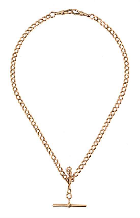 The curb link chain stamped 15ct gold, having a t-bar pendant and two swivel clips in 9ct gold, total length 460mm.