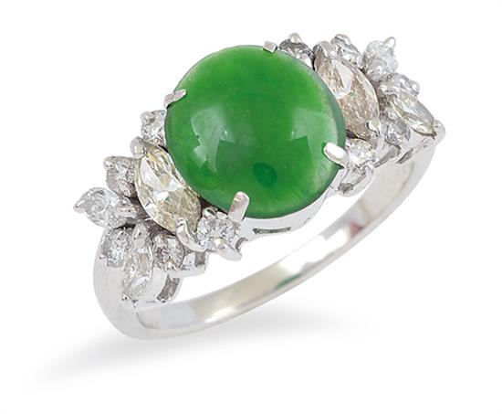 The oval jade cut en cabochon of 1.88cts, shouldered by round and marquise cut diamonds, mounted in 18ct white gold, ring size N.