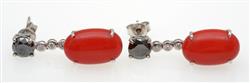 Each having an oval red coral cut en cabochon, surmounted by round brilliant cut diamonds and a round black diamond of 1.0ct, mounted in 18ct white gold.
