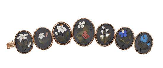 Comprising graduated oval panels inlaid with flowers, mounted in 9ct gold frames, some deficiencies to pietra dura, total length 180mm.