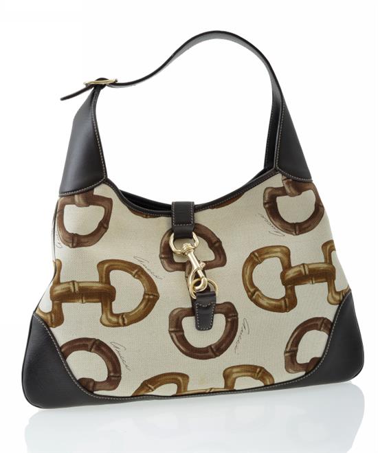 Styled in cream canvas with brown leather trim and gold metal hardware, 153029-001013, 39 x 24cm.