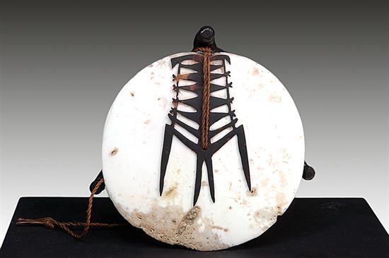 A SANTA CRUZ ISLANDS TEMA/KAP KAP, ground clam shell disc with turtle shell fret work symetrically arranged terminating in a stylized bird, 10.5 cm diameter