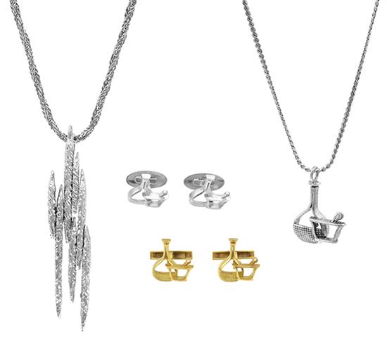 Comprising two sets of mortar and pestle cufflinks, one in 18ct gold and one in silver, with a matching mortar and pestle diamond set pendant and an abstract style pendant and chain, both in silver.