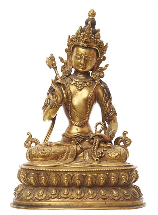 The Manjushri is wearing a crown, eyes cast down, left hand holding the rope, right hand holding an axe, sitting on a double lotus pedestal, the statue was produced in Beijing possibly in the 18th century, 25cm high.