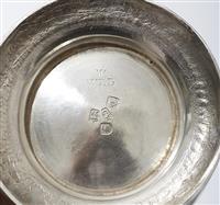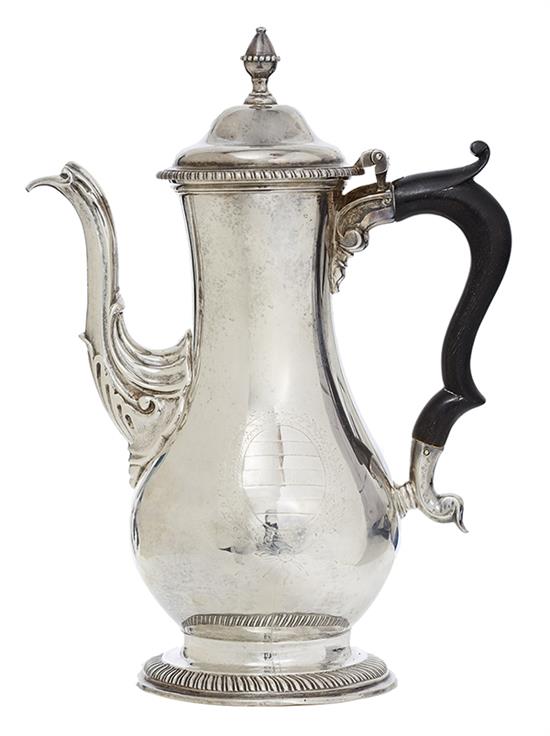 Of baluster form, the domed-hinged cover with acorn finial and gadrooned rim, the wood scroll handle with shell moulded junction, with acanthus scroll moulded spout, on a gadrooned circular foot, engraved with armorial cartouche, 742 grams, 26cm high.