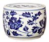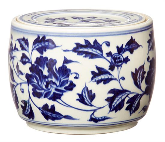 The drum shaped pot with a flat lid, patterned with interlocking peonies and plants, six character Xuande mark to the base, 14.5cm diameter.