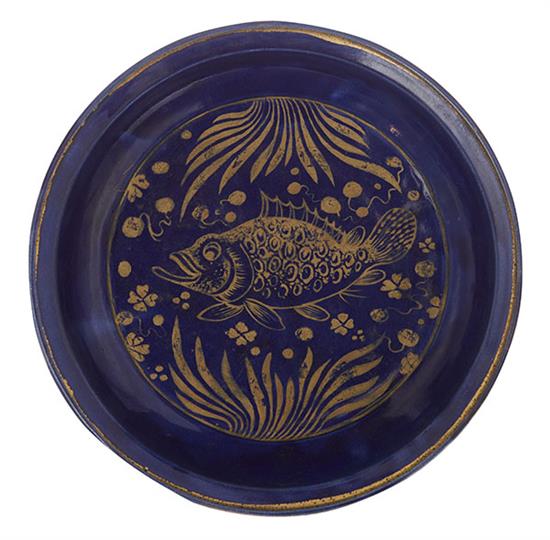 Gilded reed design and swimming Madarin fish, in the early Ming style, 23.5cm width.