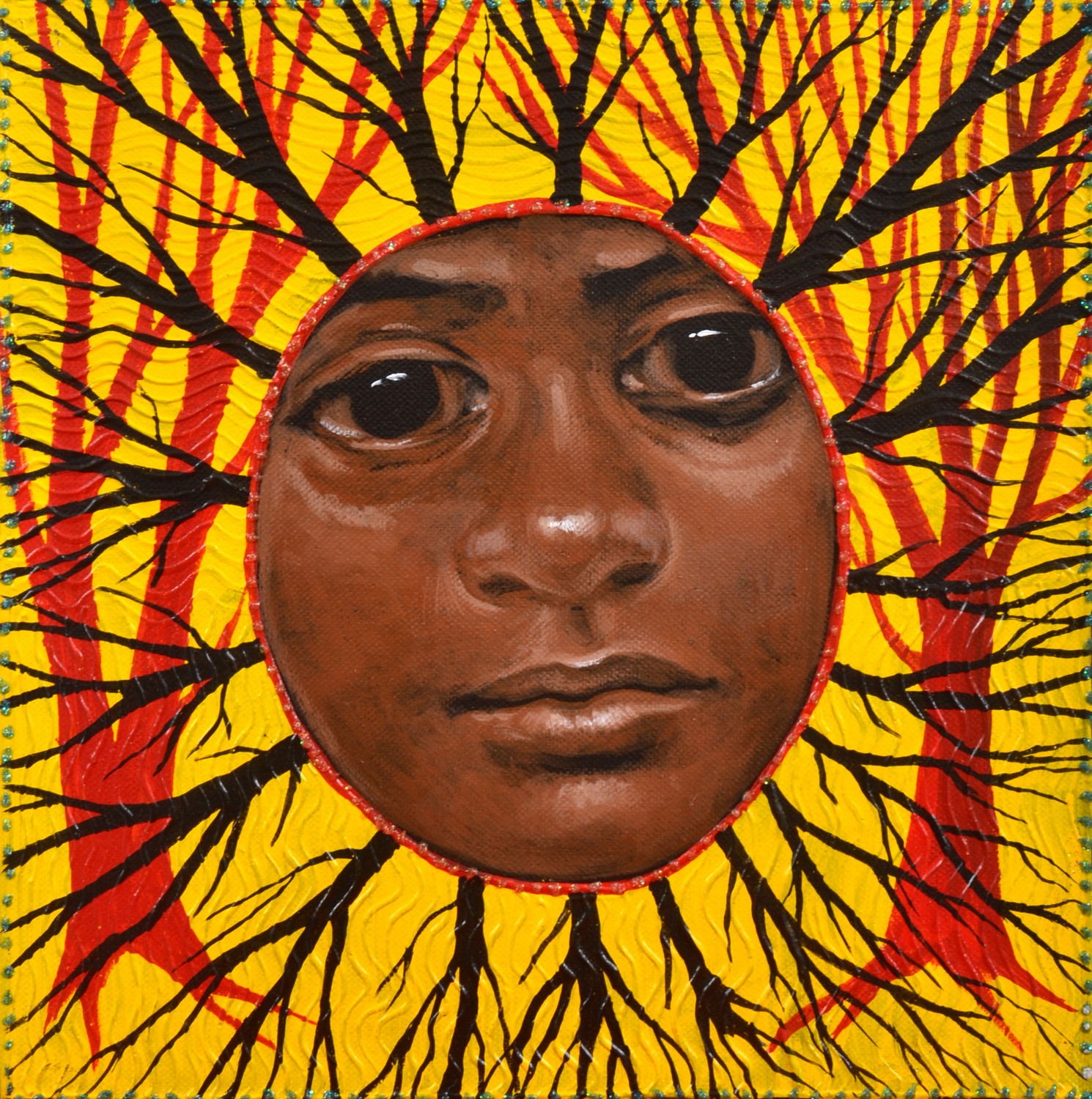 acrylic, red ochre and plastic on canvas