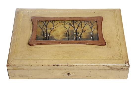A DAUM 'WINTER LANDSCAPE' INSET GLASS PANEL TOPPED LEATHER CIGAR BOX