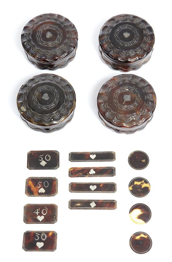 A SET OF LATE 19TH CENTURY TORTOISESHELL AND PIQUE GAME COUNTERS AND BOXES