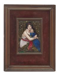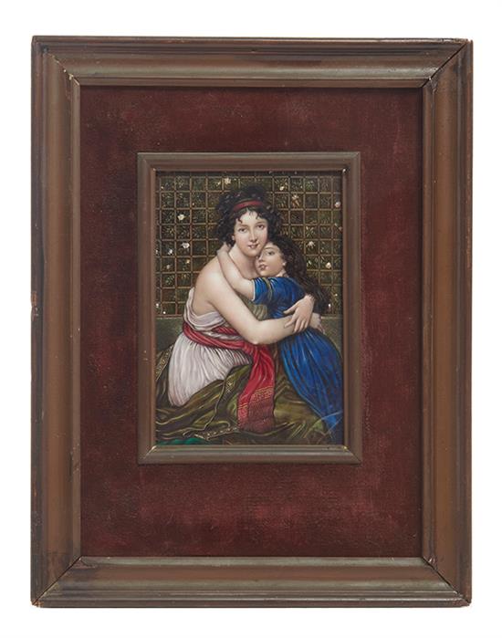 depicting a mother and daughters embrace, within frame and velvet mount, restoration to lower right corner, 13.5cm x 9cm within frame.
