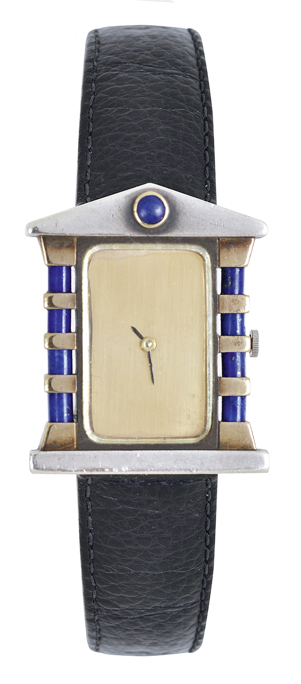Quartz movement, gold rectangular dial, with architectural style case set with lapis lazuli, in sterling silver and 18ct gold, to black leather bands, case length 36mm, circa 1980.
