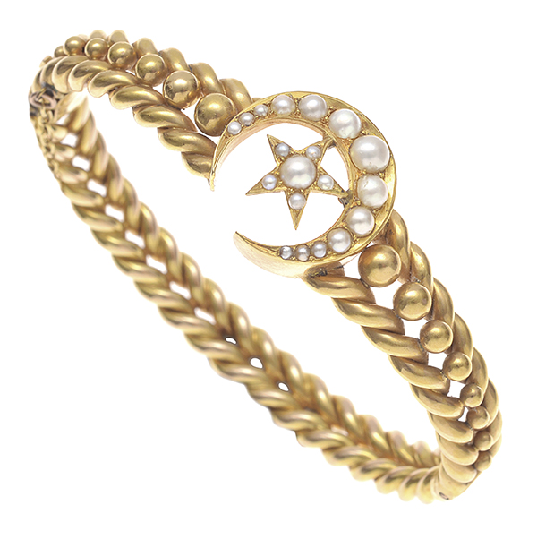 The hinged bangle of plaited design, featuring gold ball decoration and a central crescent and star set with seed pearls, in 15ct gold, boxed.