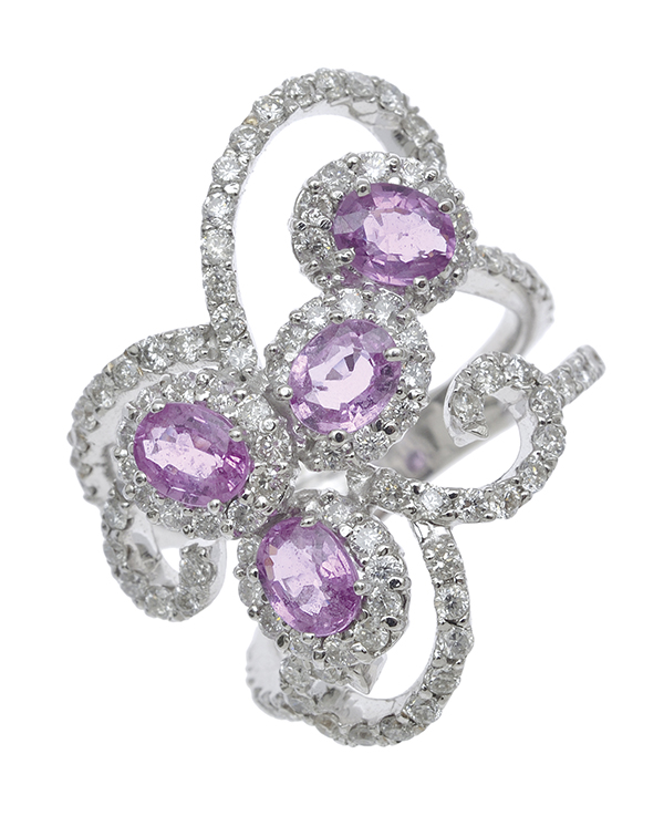 Of abstract cluster design, featuring pink sapphires and round brilliant cut diamonds, in 18ct white gold, ring size L-M.