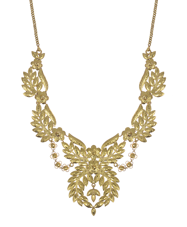 Comprising floral and foliate style links in textured and engraved finish in 24ct gold, suspended on a fine curb link chain in 22ct gold, total weight 33.7gms, total length 380mm.