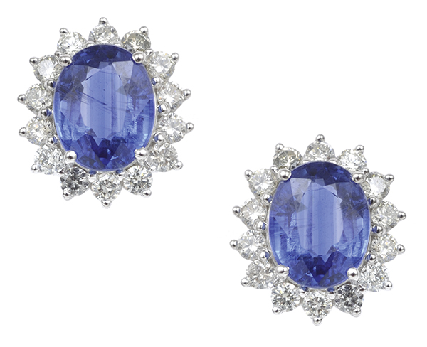 Of cluster design, each earring featuring an oval kyanite weighing 2.5cts, within a border of round brilliant cut diamonds, to post and butterfly fittings, in 18ct white gold.