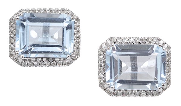Each earring featuring an emerald cut topaz weighing 2.55cts, within a fine border of round brilliant cut diamonds, to post and butterfly fittings, in 18ct white gold.