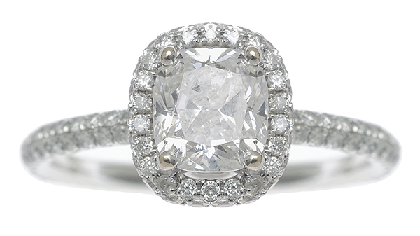 Of cluster design, featuring a modified brilliant cushion cut diamond weighing 1.02cts, within a fine border of round brilliant cut diamonds, and diamond set shoulders, in 18ct white gold, GIA certificate available stating colour F and clarity SI1, ring size M.