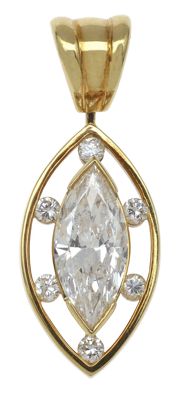 Of Belle Epoque design, the pendant features an octahedral faceted diamond weighing an estimated 12.5cts, suspended within a pear sha