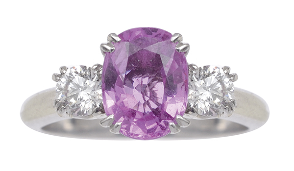 Featuring an oval pink sapphire weighing 1.77cts, flanked by a round brilliant cut diamond to either side, together totalling 0.42cts, in 18ct white gold, ring size L.