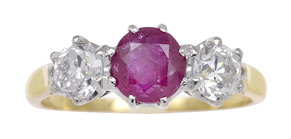 Featuring an oval ruby weighing 1.06cts, flanked by an old European cut diamond to either side, together totalling 0.80cts, in 18ct gold, ring size M-N.