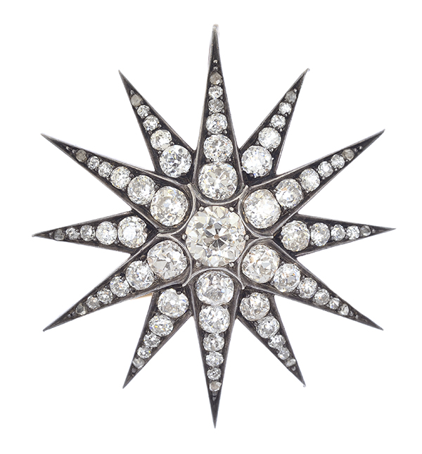 Featuring a central old European cut diamond weighing 1.70cts, within a twelve pointed star, grain set with further diamonds totalling 7.30cts, to a pendant fitting and a detachable pin fitting, in 15ct gold and silver.