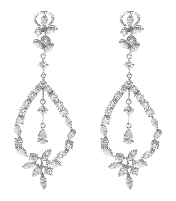 Each earring comprising an open teardrop shaped frame of round brilliant and marquise cut diamonds, centred with an articulated diamond set drop, to conforming cluster style post and clip fittings, altogether totalling 4.22cts, in 18ct white gold.
