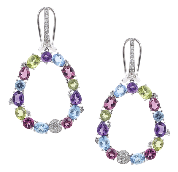 Of open oval form, comprising multi coloured gems including amethyst, peridot, topaz and sapphire, with fine diamond detail, to diamond set hoop fittings, in 18ct white gold.