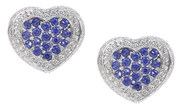 Each heart shaped concave plaque, set to the centre with blue sapphires, within a border of round brilliant cut diamonds, to post and clip fittings, in 18ct white gold.