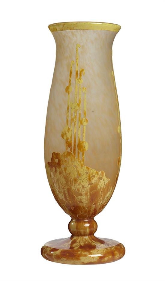 overlaid and acid-etched with stylized tendril plants in orange hues, signed 'Le Verre Francais' to foot, acid etched FRANCE to base, 31cm high.