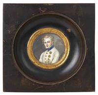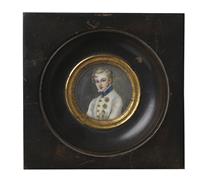 A young officer, wearing white coat with high blue collar and black stock and rosettes, carrying sword, signed with initials R.I.