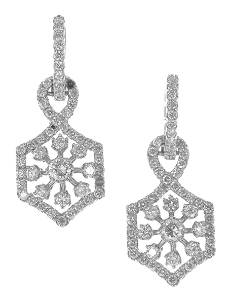 Each earring featuring a hexagonal cluster of round brilliant cut diamonds, suspended on a diamond set hoop, altogether totalling 2.08cts, in 18ct white gold.