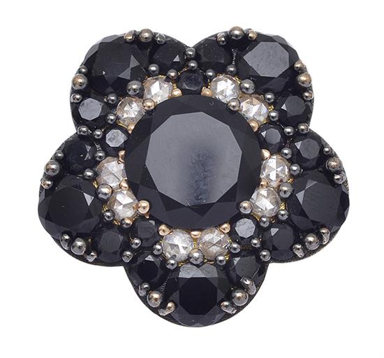 Of flower cluster design, set with round onyx and rose cut diamonds in 18ct gold, ring size M.