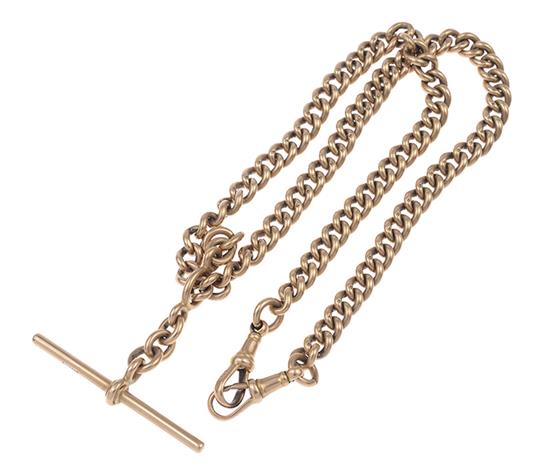 Of curb link design with t-bar fob, total length 376mm, in 15ct gold.