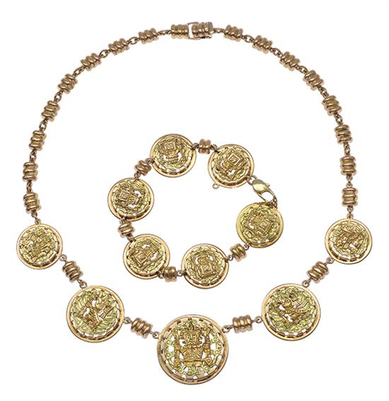 Comprising a necklace, bracelet and pair of earrings with pierced roundels of Aztec design, total weight 104gms, in 18ct yellow and rose gold.